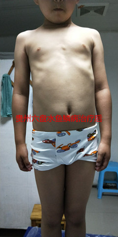 2018年7月23日,贵州省六盘水水城县XX 镇鱼鳞病患者,男,7岁皮肤全身干燥粗糙,孩子很可爱、没有过微笑小脸蛋,面对医生,也不紧张。冬天比较严重,四肢严重干燥,扎手,皮肤不光滑,小腿有突出状斑纹,伴有灰褐色鳞屑,偶有皮肤瘙痒症状,有遗传因素。以前没有详细治疗过。2018年7月30号。皮肤光滑细腻有光泽,效果非常好,看图鱼鳞病症状效果对比照,今日康复出院。